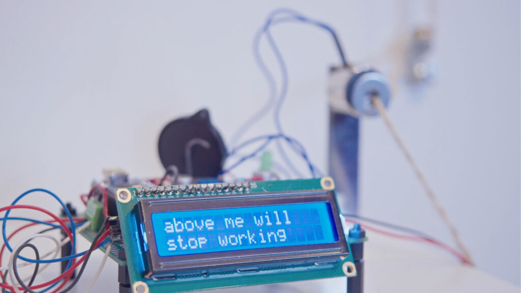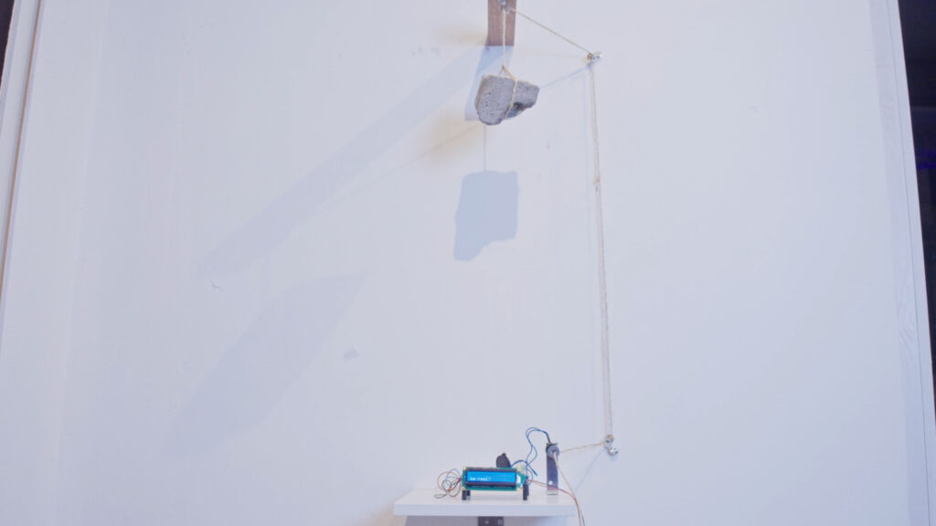 In deze poëtische kunstinstallatie van Casper de Jong spreekt een kleine computer over het bewustzijn dat erin is geprogrammeerd: net genoeg besef om te weten dat hij in de fysieke wereld bestaat, en net genoeg kennis over elektromagneten—genoeg om te begrijpen dat deze magneten stoppen met werken op het moment dat de elektriciteit uitvalt.